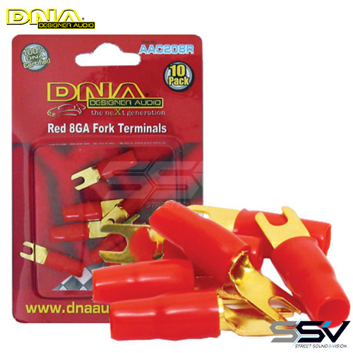 Gold plated 8 gauge fork terminal with colour coded silicon rubber insulators