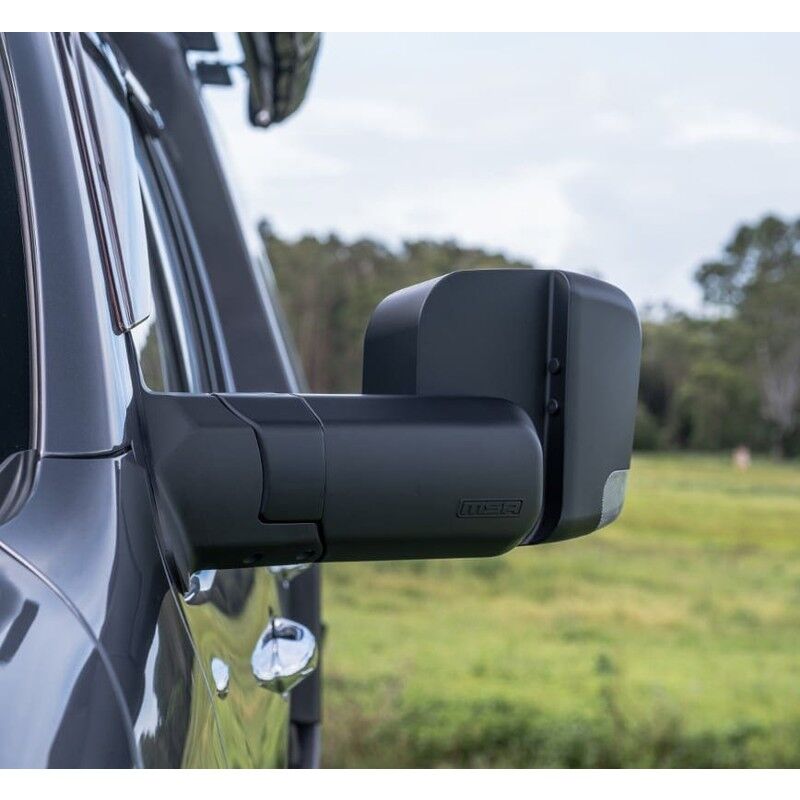 The large single mirror lens creates less confusion and enhanced safety while driving. The four, easily adjustable positions, provide greater vision, with less vibration to any towing situation, while maintaining ADR compliance and safety. When the mirror is rotated into the horizontal position, the mirror’s actuator automatically adapts, allowing for standard adjustments (up, down, side to side) from the vehicle’s standard mirror controller. This caters to drivers of differing height and seated positions. Designed to fold inwards or outwards when bumped in car parks, or when contact is made with trees and other obstacles around the vehicle. Simple to fit. MSA 4X4’s Towing Mirrors mount onto a vehicle door in the same position as the existing mirrors. Most factory mirror functions are retained and come with the choice of black or chrome.The MSA 4X4 patented Towing Mirrors are manufactured extremely tough.Injection moulded and die cast aluminium components deliver a high-quality towing mirror to withstand Australian conditions. A great all-around mirror for towing caravans, camper trailers, trailers, boats and horse floats. Available to suit a growing range of towing vehicles.