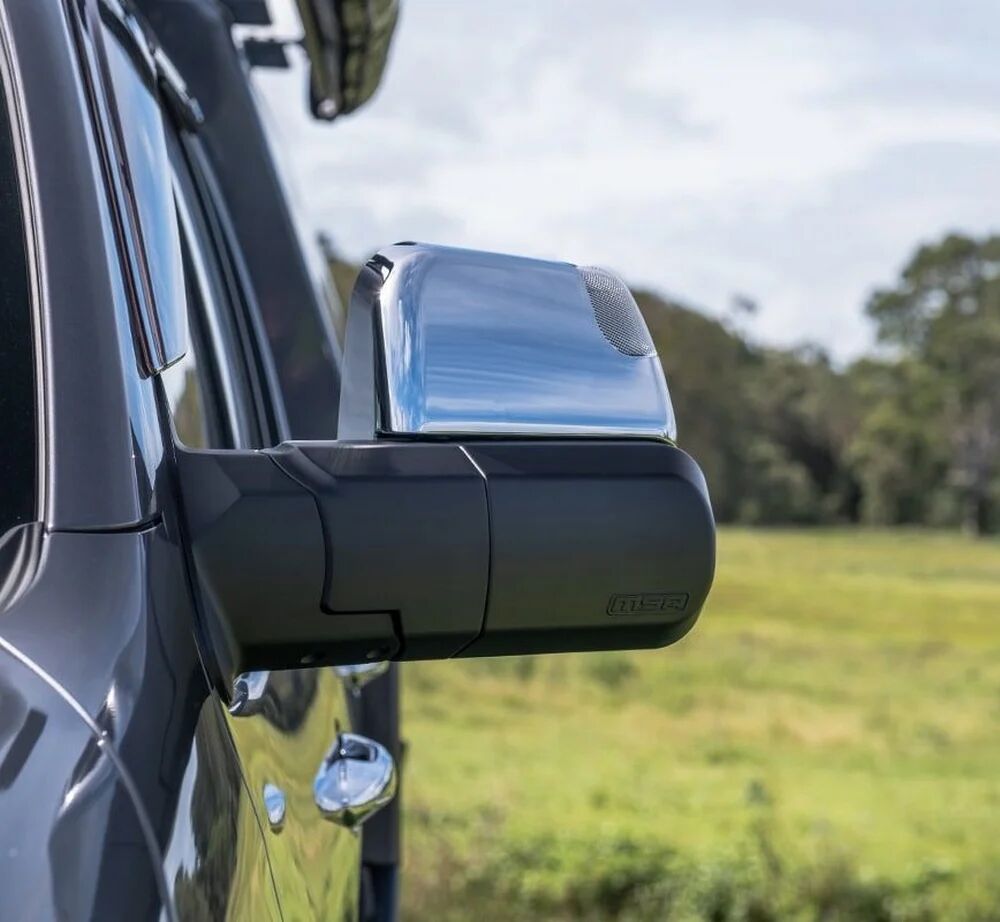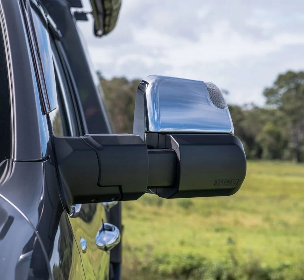 The large single mirror lens creates less confusion and enhanced safety while driving. The four, easily adjustable positions, provide greater vision, with less vibration to any towing situation, while maintaining ADR compliance and safety. When the mirror is rotated into the horizontal position, the mirror's actuator automatically adapts, allowing for standard adjustments (up, down, side to side) from the vehicle's standard mirror controller. This caters to drivers of differing height and seated positions. Designed to fold inwards or outwards when bumped in car parks, or when contact is made with trees and other obstacles around the vehicle. Simple to fit. MSA 4X4's Towing Mirrors mount onto a vehicle door in the same position as the existing mirrors. Most factory mirror functions are retained and come with the choice of black or chrome.The MSA 4X4 patented Towing Mirrors are manufactured extremely tough.Injection moulded and die cast aluminium components deliver a high-quality towing mirror to withstand Australian conditions. A great all-around mirror for towing caravans, camper trailers, trailers, boats and horse floats. Available to suit a growing range of towing vehicles.