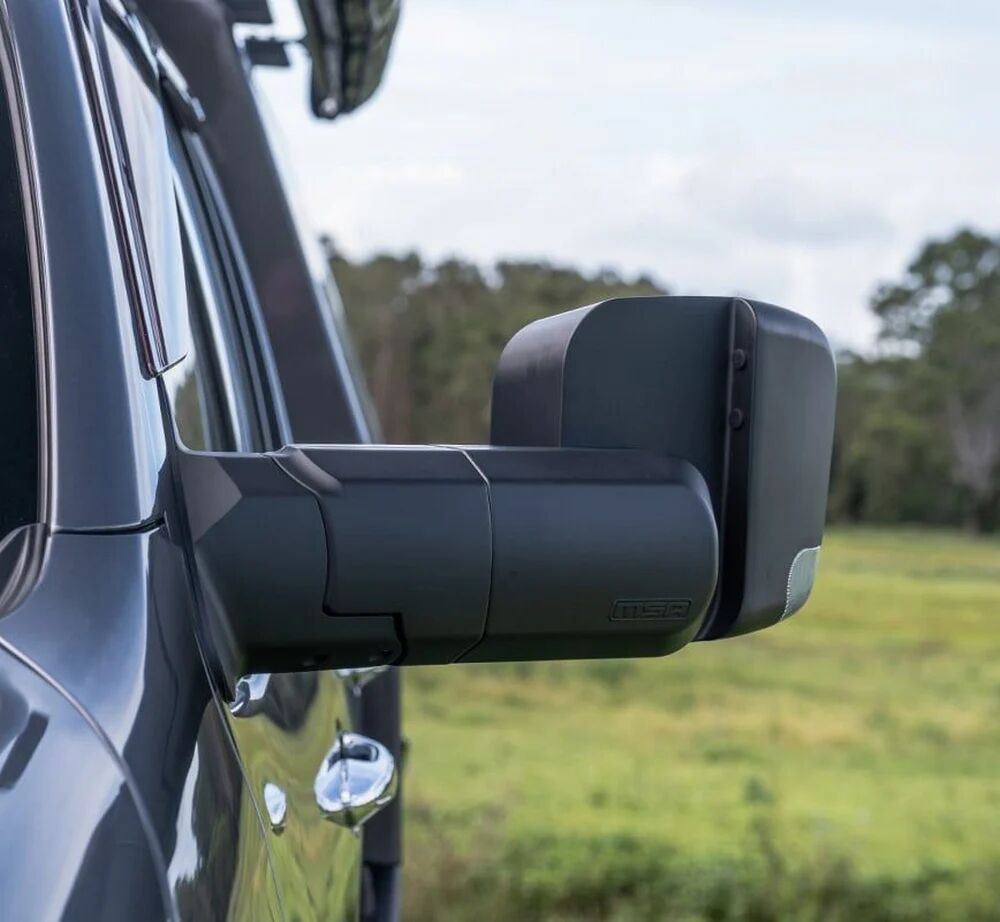 The large single mirror lens creates less confusion and enhanced safety while driving. The four, easily adjustable positions, provide greater vision, with less vibration to any towing situation, while maintaining ADR compliance and safety. When the mirror is rotated into the horizontal position, the mirror's actuator automatically adapts, allowing for standard adjustments (up, down, side to side) from the vehicle's standard mirror controller. This caters to drivers of differing height and seated positions. Designed to fold inwards or outwards when bumped in car parks, or when contact is made with trees and other obstacles around the vehicle. Simple to fit. MSA 4X4's Towing Mirrors mount onto a vehicle door in the same position as the existing mirrors. Most factory mirror functions are retained and come with the choice of black or chrome.The MSA 4X4 patented Towing Mirrors are manufactured extremely tough.Injection moulded and die cast aluminium components deliver a high-quality towing mirror to withstand Australian conditions. A great all-around mirror for towing caravans, camper trailers, trailers, boats and horse floats. Available to suit a growing range of towing vehicles.