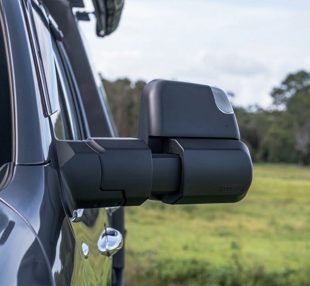 The large single mirror lens creates less confusion and enhanced safety while driving. The four, easily adjustable positions, provide greater vision, with less vibration to any towing situation, while maintaining ADR compliance and safety. When the mirror is rotated into the horizontal position, the mirror's actuator automatically adapts, allowing for standard adjustments (up, down, side to side) from the vehicle's standard mirror controller. This caters to drivers of differing height and seated positions. Designed to fold inwards or outwards when bumped in car parks, or when contact is made with trees and other obstacles around the vehicle. Simple to fit. MSA 4X4's Towing Mirrors mount onto a vehicle door in the same position as the existing mirrors. Most factory mirror functions are retained and come with the choice of black or chrome.The MSA 4X4 patented Towing Mirrors are manufactured extremely tough.Injection moulded and die cast aluminium components deliver a high-quality towing mirror to withstand Australian conditions. A great all-around mirror for towing caravans, camper trailers, trailers, boats and horse floats. Available to suit a growing range of towing vehicles.