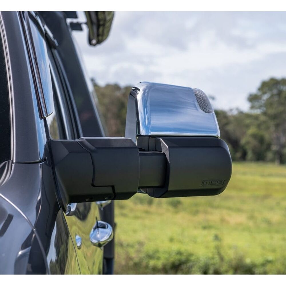 The large single mirror lens creates less confusion and enhanced safety while driving. The four, easily adjustable positions, provide greater vision, with less vibration to any towing situation, while maintaining ADR compliance and safety. When the mirror is rotated into the horizontal position, the mirror’s actuator automatically adapts, allowing for standard adjustments (up, down, side to side) from the vehicle’s standard mirror controller. This caters to drivers of differing height and seated positions. Designed to fold inwards or outwards when bumped in car parks, or when contact is made with trees and other obstacles around the vehicle. Simple to fit. MSA 4X4’s Towing Mirrors mount onto a vehicle door in the same position as the existing mirrors. Most factory mirror functions are retained and come with the choice of black or chrome.The MSA 4X4 patented Towing Mirrors are manufactured extremely tough.Injection moulded and die cast aluminium components deliver a high-quality towing mirror to withstand Australian conditions. A great all-around mirror for towing caravans, camper trailers, trailers, boats and horse floats. Available to suit a growing range of towing vehicles.