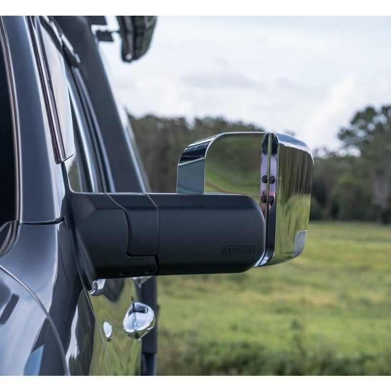 The large single mirror lens creates less confusion and enhanced safety while driving. The four, easily adjustable positions, provide greater vision, with less vibration to any towing situation, while maintaining ADR compliance and safety. When the mirror is rotated into the horizontal position, the mirror’s actuator automatically adapts, allowing for standard adjustments (up, down, side to side) from the vehicle’s standard mirror controller. This caters to drivers of differing height and seated positions. Designed to fold inwards or outwards when bumped in car parks, or when contact is made with trees and other obstacles around the vehicle. Simple to fit. MSA 4X4’s Towing Mirrors mount onto a vehicle door in the same position as the existing mirrors. Most factory mirror functions are retained and come with the choice of black or chrome.The MSA 4X4 patented Towing Mirrors are manufactured extremely tough.Injection moulded and die cast aluminium components deliver a high-quality towing mirror to withstand Australian conditions. A great all-around mirror for towing caravans, camper trailers, trailers, boats and horse floats. Available to suit a growing range of towing vehicles.