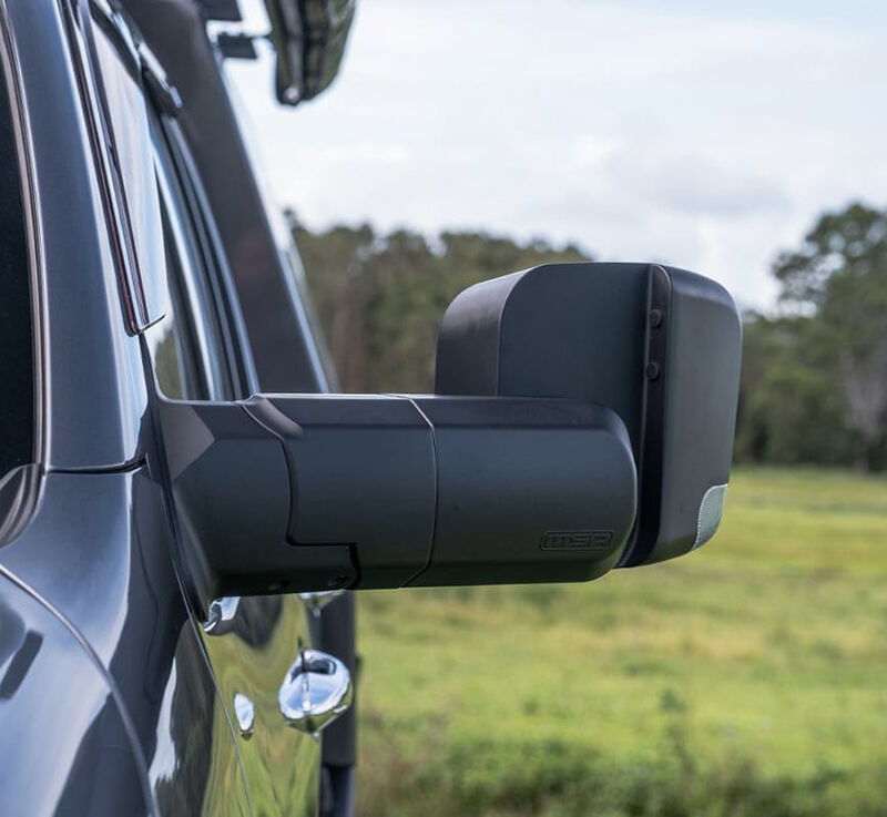 Designed to fold inwards or outwards when bumped in car parks, or when contact is made with trees and other obstacles around the vehicle. Simple to fit. MSA 4X4s Towing Mirrors mount onto a vehicle door in the same position as the existing mirrors. Most factory mirror functions are retained and come with the choice of black or chrome.The MSA 4X4 patented Towing Mirrors are manufactured extremely tough.Injection moulded and die cast aluminium components deliver a high-quality towing mirror to withstand Australian conditions. A great all-around mirror for towing caravans, camper trailers, trailers, boats and horse floats. Available to suit a growing range of towing vehicles.